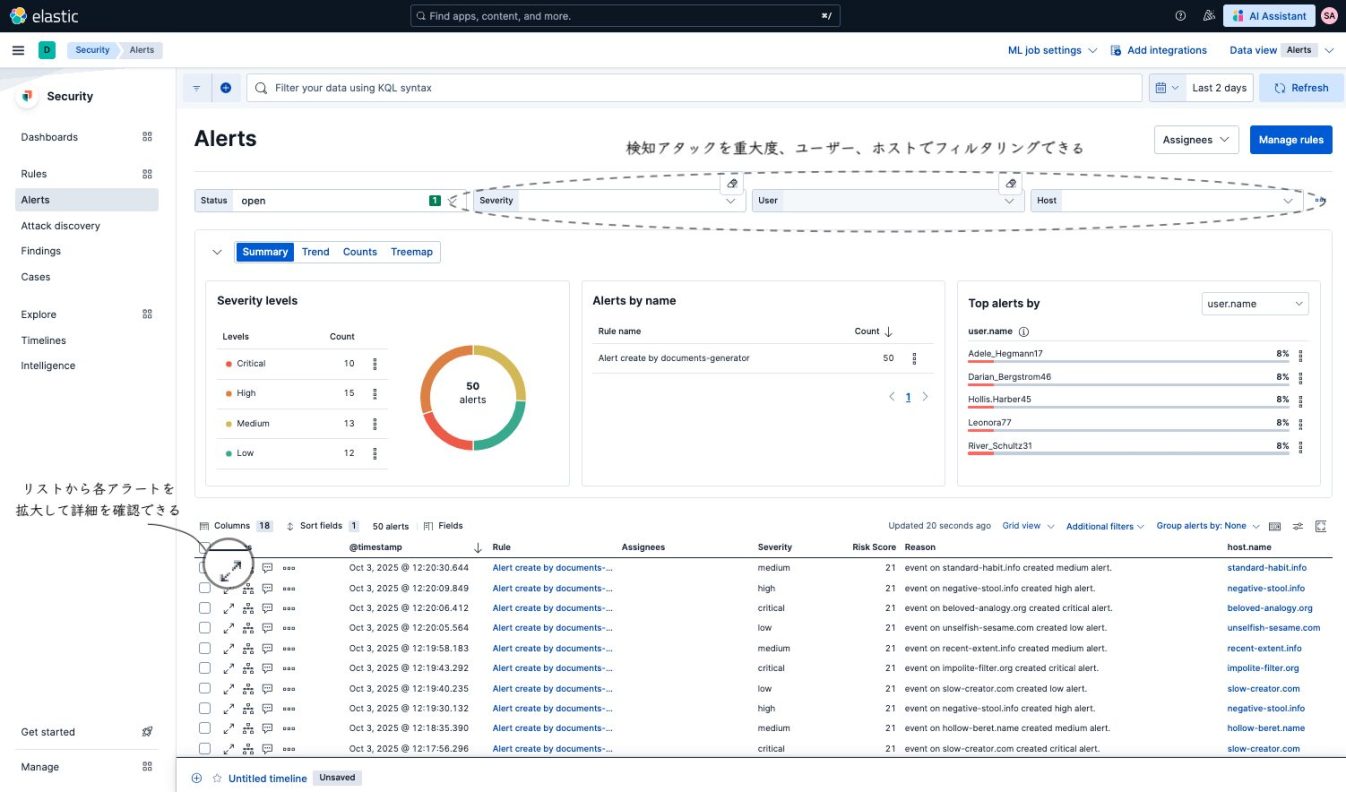 AI Assistant:Elasticが提供するAI搭載の対話型アシスタント機能。セキュリティアナリストがAIに質問したり、分析を依頼したりできる、デジタルな相談相手のようなツールです。